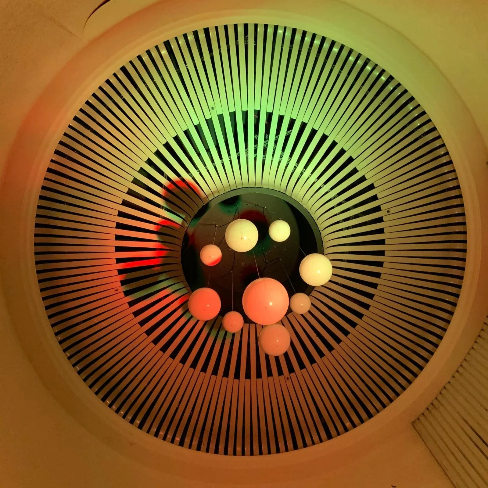 The suitably weird and retro light fitting at the top of the spiral staircase.